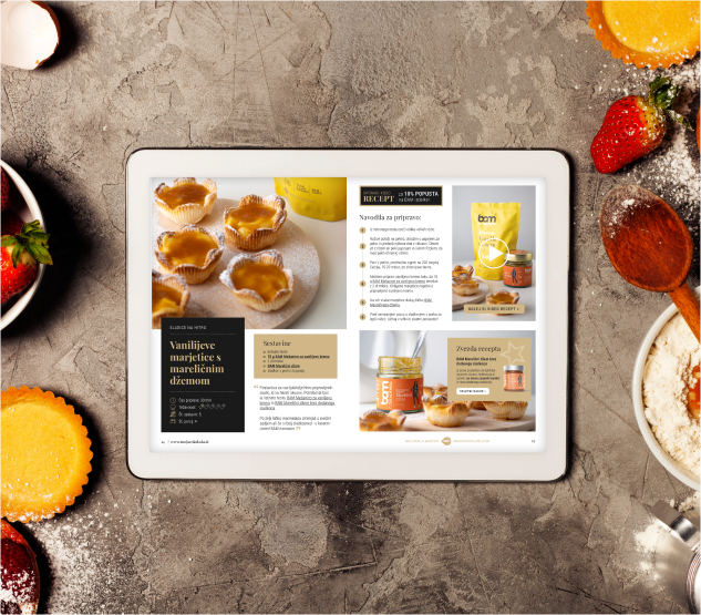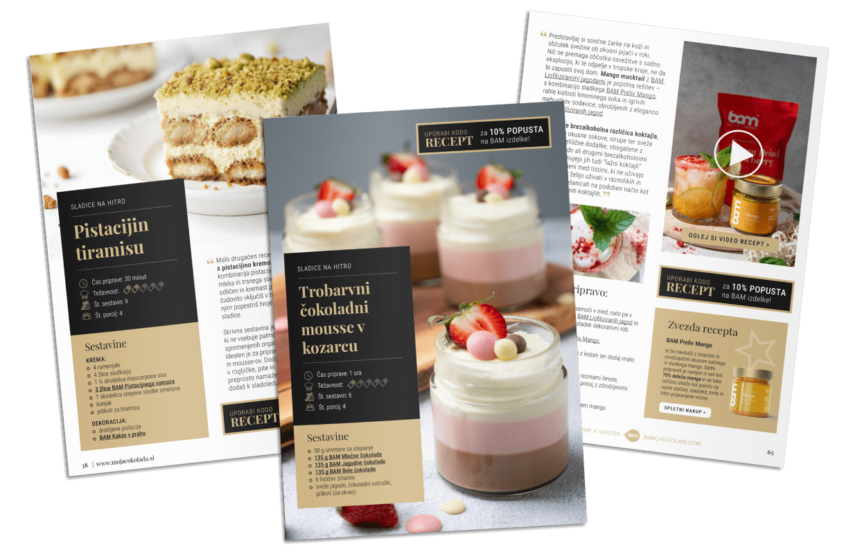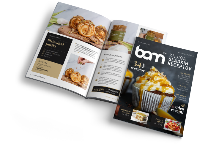 Vsak recept je podrobno opisan – od sestavin do postopka priprave, da bo peka preprosta in zabavna. Večina receptov vsebuje interaktivne povezave do video receptov, ki te korak za korakom vodijo do popolne sladice. Zvezde receptov so seveda vrhunski BAM izdelki, ki dodajo piko na i vsakemu grižljaju. Da bo tvoje ustvarjanje še bolj brezskrbno, lahko večino sladkih sestavin enostavno naročiš kar prek naše spletne strani. In to s posebnim, 10 % popustom!