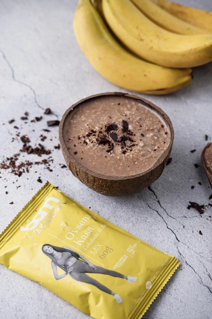 Ovseni kosmiči 55 %, koncentrat sirotkinih beljakovin 28,9 %, koruzni škrob, modificiran koruzni škrob, čokolada 2,5 % (sladilo: D-maltitol, kakavovo maslo, kakavova masa, manj masten kakav v prahu, emulgator sončnični lecitin, izvleček burbonske vanilije), liofilizirana banana 1 %, manj masten kakav v prahu (10-12%), arome, sol, vitaminski kompleks (C, E, B1, B2, B5, B6, B9, B12, niacin, biotin), sladilo (sukraloza). Kakavovi deli najmanj 54 %.