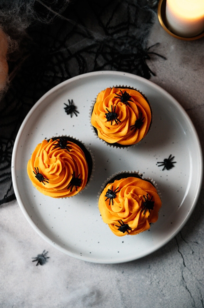 Pripravi strašno dobre kolačke z bogatim okusom črnega kakava in nežno kremo iz pomarančne čokolade. Ti kolački so popolna izbira za zabavo ob Noč...
