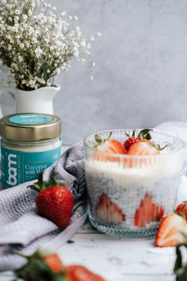 Kokosov chia puding z jagodami je slastna, hranljiva in osvežilna poslastica, ki združuje nežne okuse chia pudinga in sladkobo svežih jagod z edinstvenim dodatkom BAM kokosovega preliva z vaflji.
