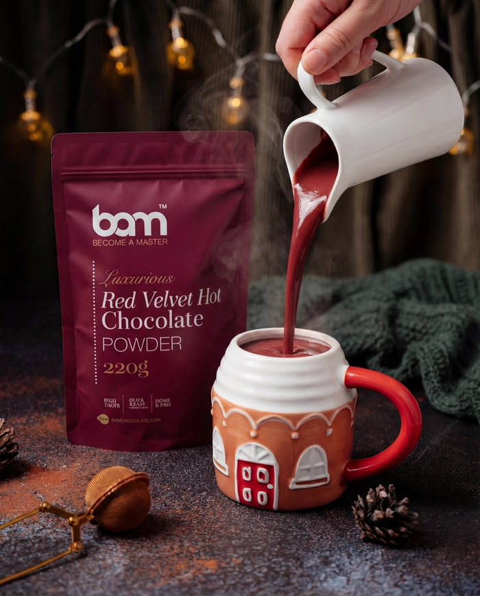 BAM Red Velvet vroča čokolada je ustvarjena za vse, ki si želijo nekaj več kot klasično vročo čokolado. Njena prepoznavna rdeča barva in bogata, kremna struktura pričarata pravo sladko doživetje, ki izstopa že na prvi pogled.