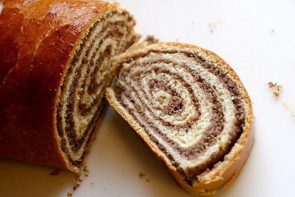 5 Vzhajano testo razvaljajte in premažite z nadevom. Zvijte in položite na pekač, obložen s papirjem za peko.
