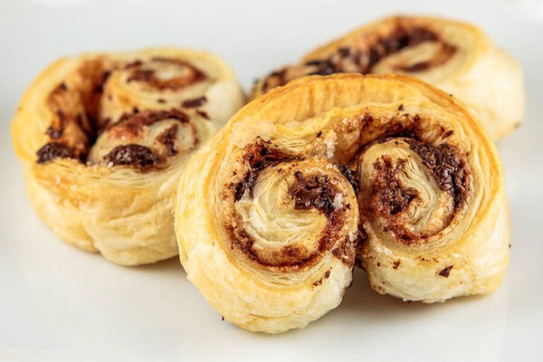 2 Testo razrežite na trakce in nato naredite palmice. Naredite jih tako, da jih zložite najprej iz enega konca in nato z drugega, tako da se oba konca združita na sredini. Pripravljene palmice položite na pladenj.