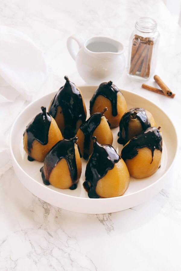 3 Hruške kuhamo približno 10 - 15 minut. Kuhane nato prelijemo s stopljeno čokolado, ohladimo in postrežemo s stepeno sladko smetano ali sladoledom.