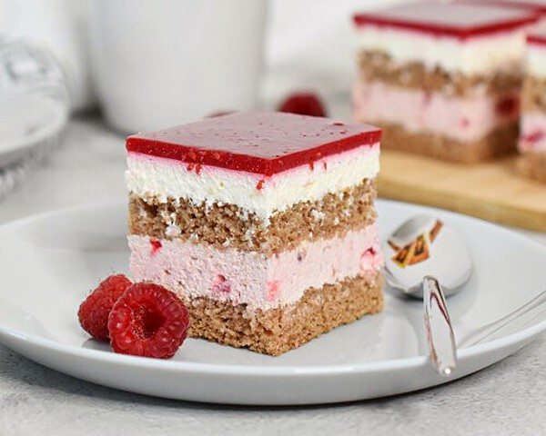 6 Mlačen malinov pire enakomerno prelijemo po kremi. Pecivo ohlajamo vsaj 6 ur, nato ga narežemo na kocke in poljubno dekoriramo.