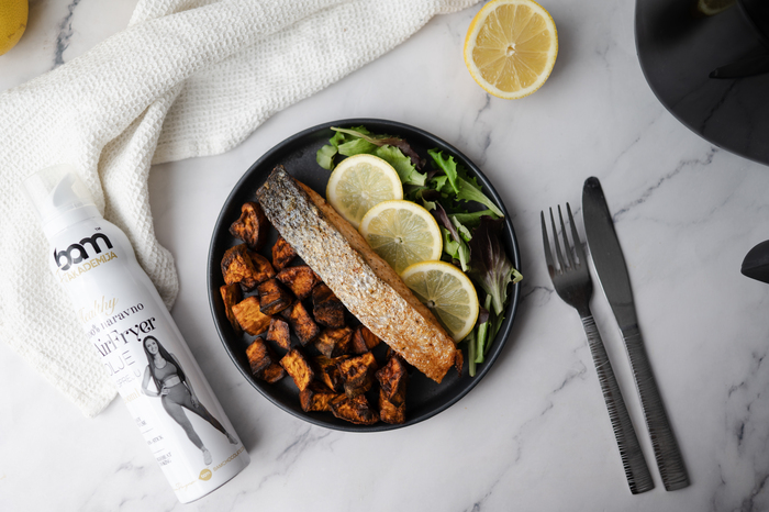 Pečen losos in sladki krompir iz airfryerja z BAM Air Fryer oljem si