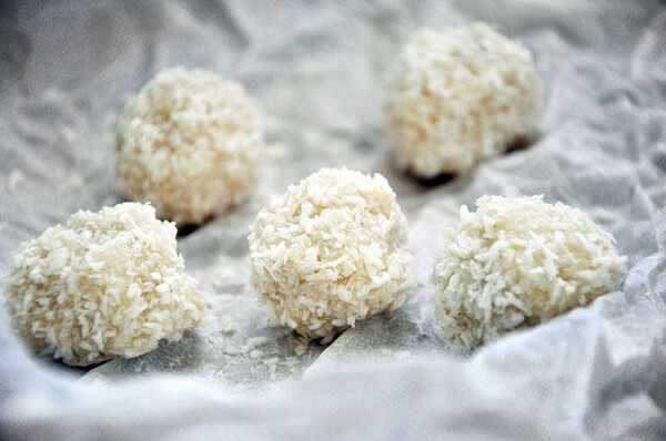 4 Ko je krema strjena je pripravljena na oblikovanje. S čajno žličko si lahko pomagate zajeti strjeno kremo, ki jo nato še z rokami oblikujete v kroglice. Vsako povaljajte še v kokosovih kosmičih.