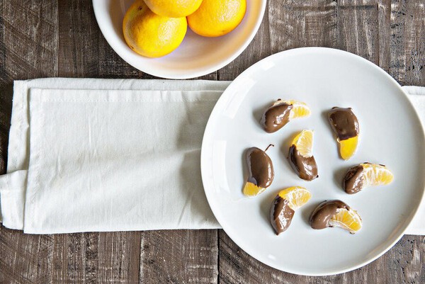 1 Pomaranče olupite, razdelite na krhlje in jih posušite. Čokolado stopite nad vodno kopeljo ali v mikrovalovni pečici dokler ni povsem gladka.