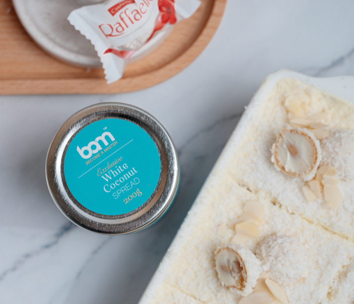 6 Končno plast tiramisuja potresite s kokosovo moko in po želji okrasite z raffaelloti.