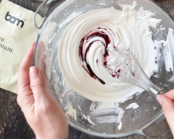 1 V večji suhi posodi pripravimo nesladkano sladko smetano za stepanje in jo z ročnim električnim mešalnikom stepemo skoraj do čvrstega, dokler se na površju ne začnejo tvoriti vršički. Takšni stepeni smetani dodamo BAM mešanico za sladoled in z električnim mešalnikom dobro zmešamo stepeno smetano in sladoledno mešanico. Sladoledno osnovo prestavite v manjše posodice ter postavite v zamrzovalnik za vsaj 40 minut.