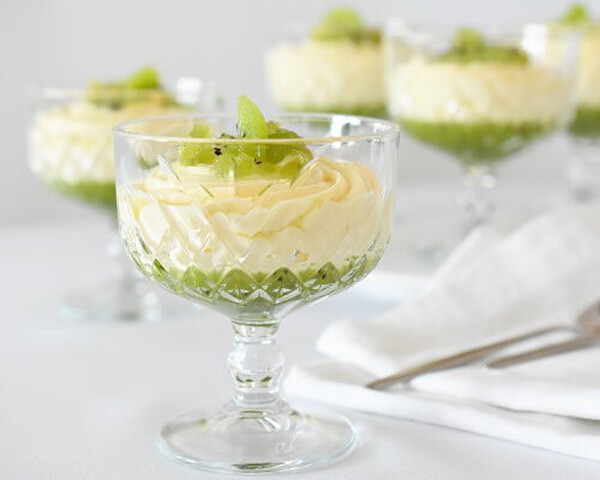 3 Dresirno vrečko napolnimo s kremo (po potrebi jo najprej gladko preme- šamo) in jo nabrizgamo v kozarce. Kivi narežemo na drobne kocke in ga dekorativno razporedimo po vrhu kreme.