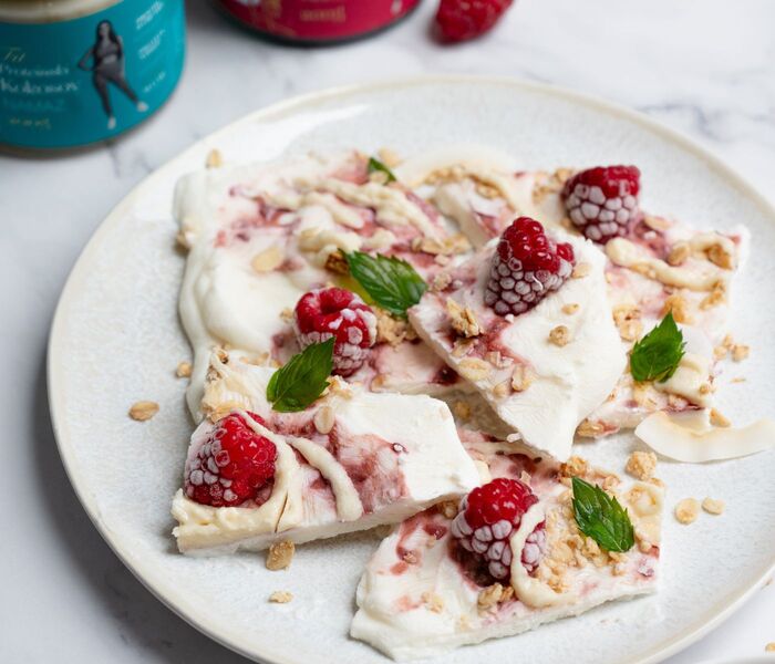 Zamrznjen grški jogurt z malinovim džemom in kokosovim namazom